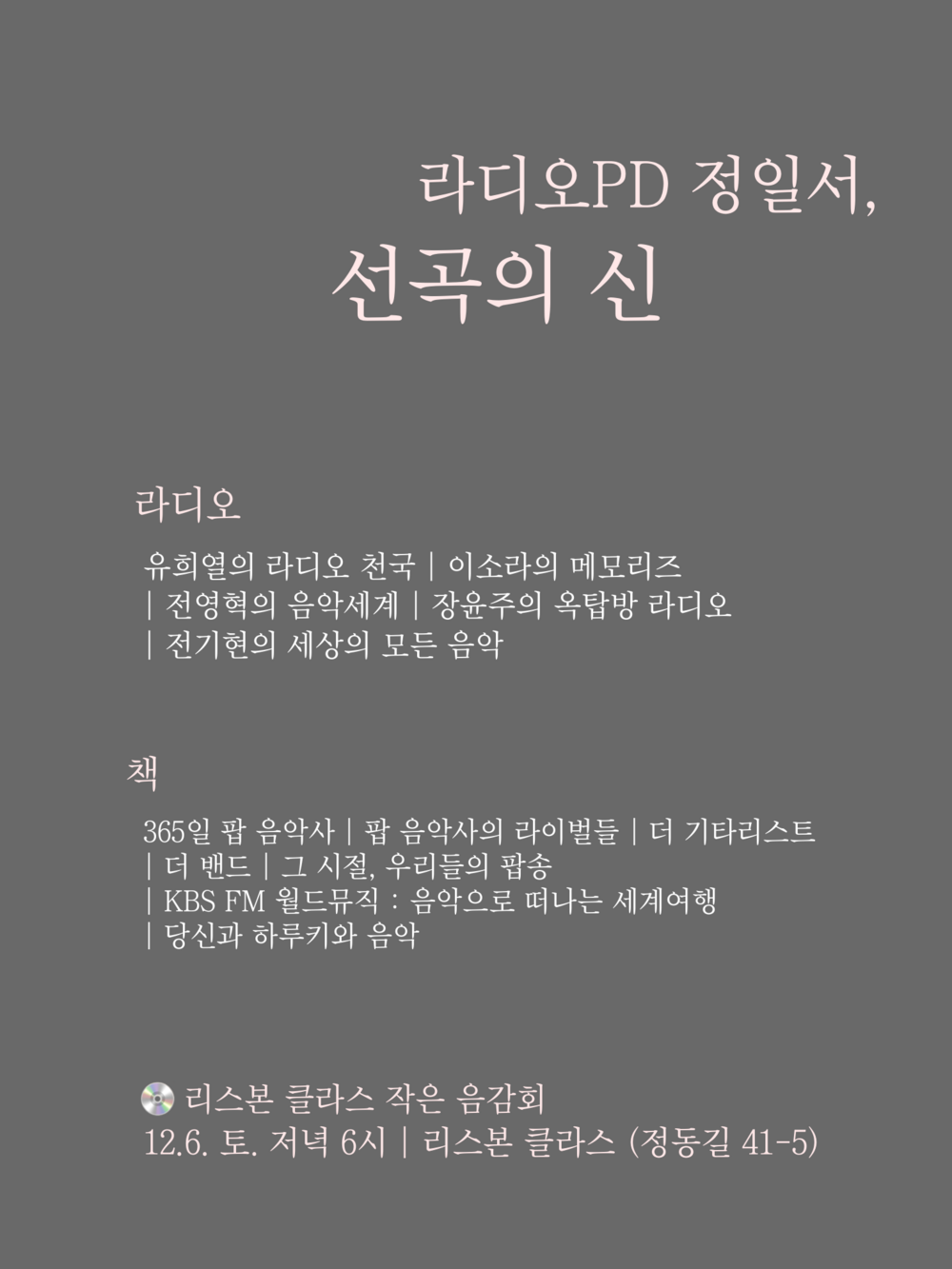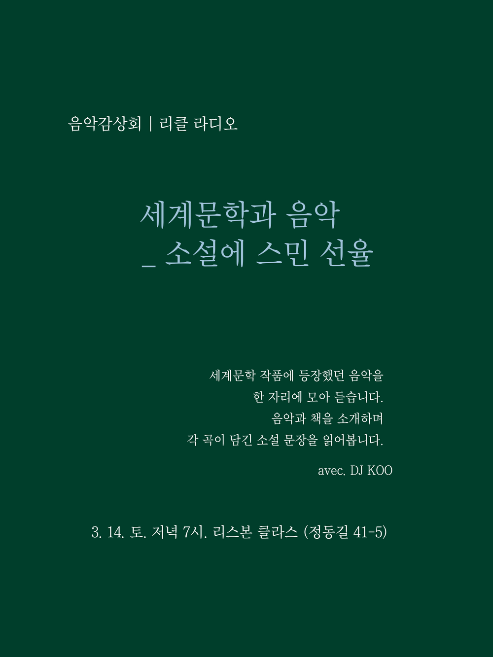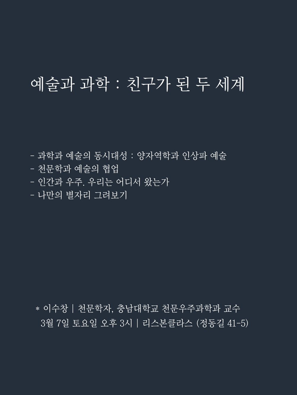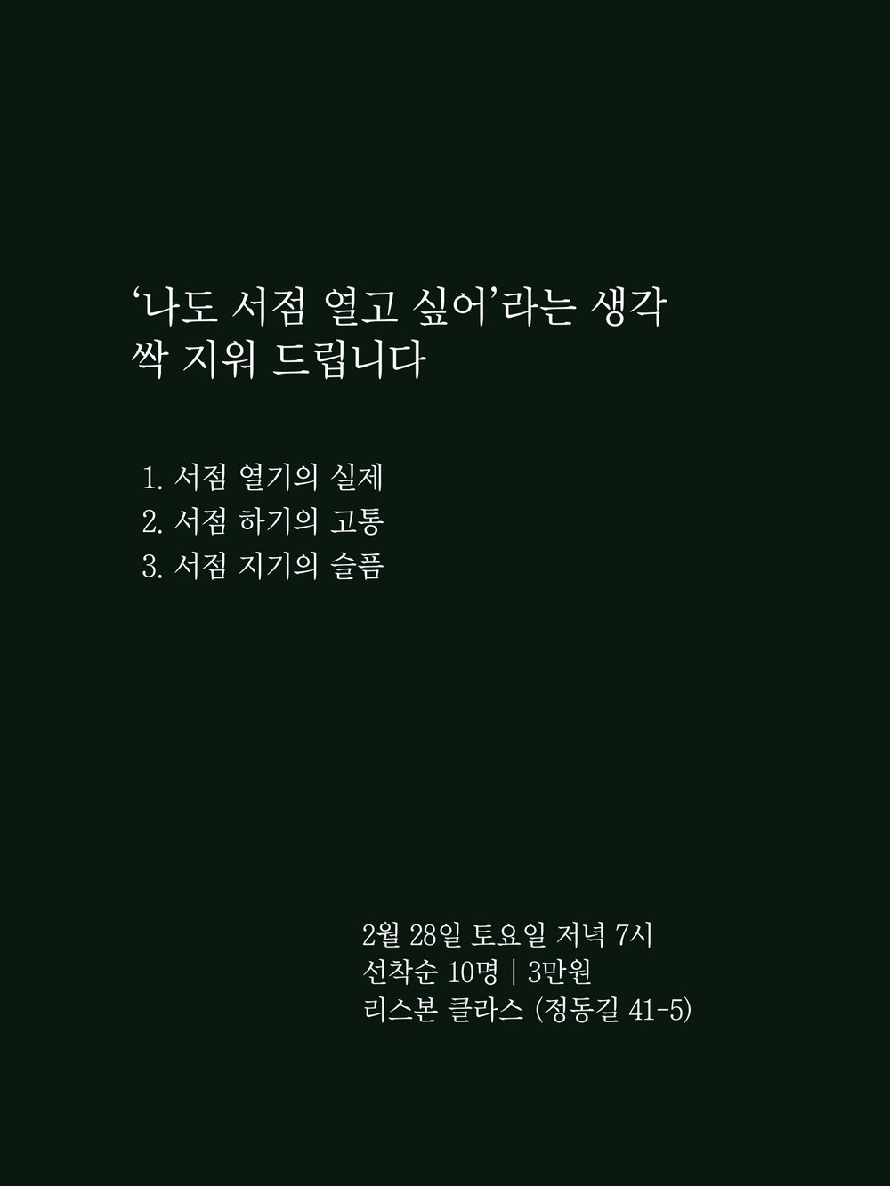 서점 리스본이 정동에 마련하는 새로운 공간입니다. 정동길 41-5 B1층 | 다양한 문화행사가 준비되며 대관이 가능합니다.